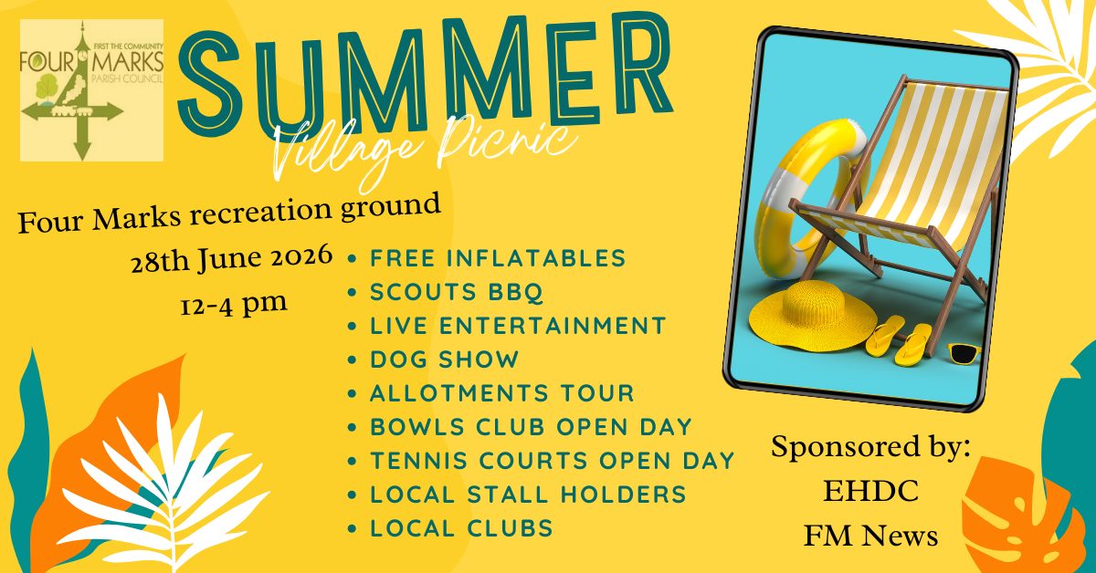Welcome to our village which is situated 4.4 miles southwest of Alton and within easy reach of London. With direct access from the A31, you will find a range of amenities and services including the Watercress line heritage railway, Oak Green parade featuring a range of shops (including a Post Office counter service) and food establishments, Four Marks Recreation ground which is where you will find the Parish Office, children's play ground, sports pavilion, allotments and tennis courts. Other areas of interest include the Church of the Good Shepherd, Four Marks Village Hall and Swelling Hill Pond. Artwork - rachelhudsonillustration.com