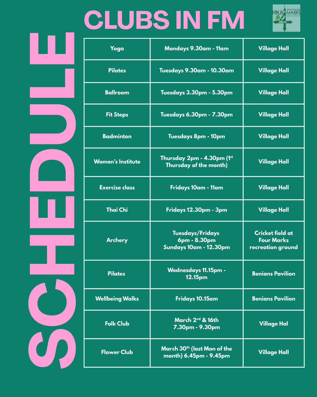 Please find a list of clubs available in Four Marks. If you'd like further details on any of them, please get in touch. admin@fourmarksparishcouncil.gov.uk